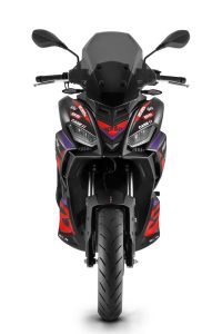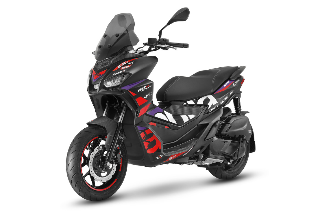 The special-edition Replica proudly flaunts its racing world-influenced credentials. With its striking aesthetic featuring a matte black body embellished with red and purple graphics, the SR GT makes no secret that it is inspired by the RS-GP25. The rear grab bar and spoiler are also in matte black, while the iconic Aprilia logo is emblazoned along the side.